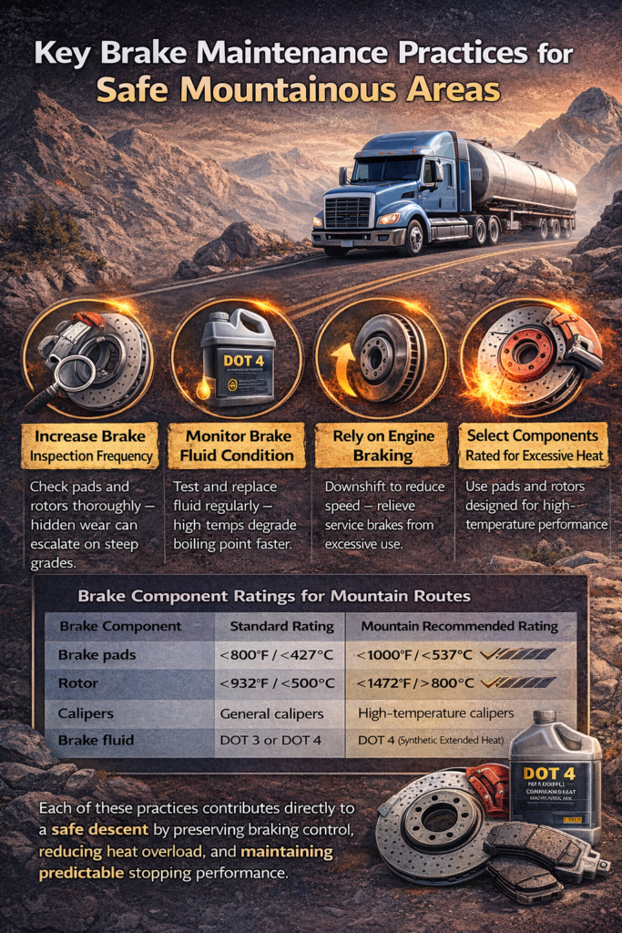 The last mistake that happens is trying to apply flat-terrain maintenance logic to mountain roads. Mountain driving is characterized by prolonged braking, less cooling, and continuous thermal cycling.