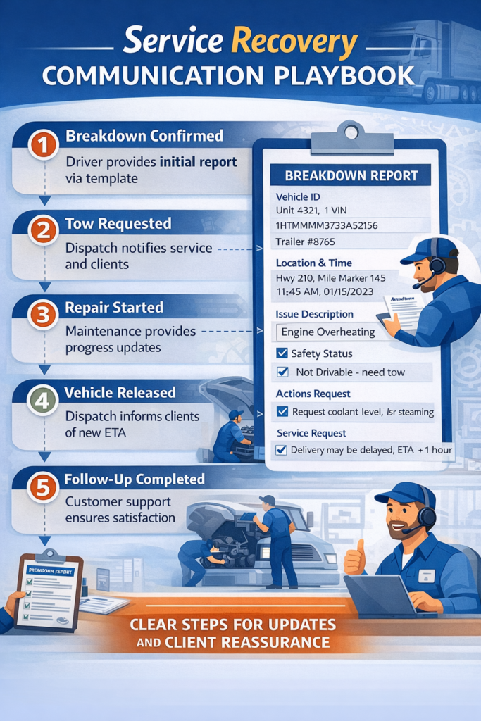 The breakdown incident is not just about repairing the truck — it is also about controlling customer expectations. A Service recovery communication playbook explains how the internal teams and clients are controlled, updated, and reassured throughout the incident’s lifetime.